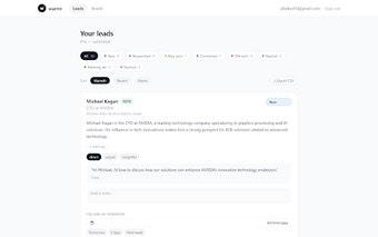 Warmr é uma ferramenta de CRM leve e eficiente que transforma o LinkedIn em um canal de vendas altamente produtivo. Integrado ao navegador Chrome, ele permite que profissionais de vendas e fundadores capturem leads com apenas um clique, eliminando a necessidade de entrada manual de dados. A cada perfil visitado, o Warmr se apresenta como uma sobreposição na barra lateral, permitindo que informações como nome, cargo e localização sejam salvas automaticamente. Além disso, um sistema de pontuação de 'calor' baseado em IA ajuda a priorizar os leads, indicando quais têm maior potencial de conversão.